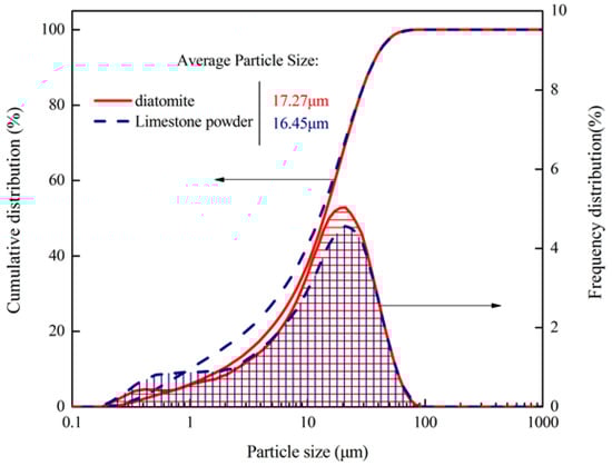 Particle size distributions of the diatomite and limestone powder.