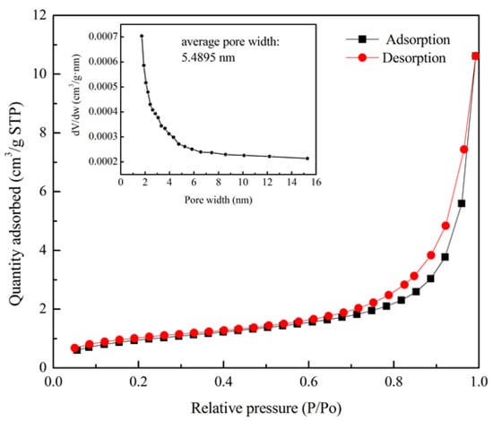 Figure 6 illustrates N2 adsorption isotherms for pore size analysis. The quantity of adsorbed N2 increases with the increase of relative pressure, where p and p0 are equilibrium pressure and saturation pressure, respectively. Less adsorption in the low-pressure zone indicates that the force between the adsorbent and the adsorbate is quite weak. In the high p/p0 range, with the rise of pressure, the adsorption rate increases significantly. It can be observed that the desorption isotherm is above the adsorption isotherm when the relative pressure is between 0.6 and 1.0. In this interval, the adsorbate condenses in capillary, resulting in desorption hysteresis. This result confirms the conclusion made by Garderen [], who found that diatomite is a layered structure with a narrow number of mesopores in it. The mesoporous distribution diagram is highlighted in Figure 6 by using the adsorption branch data. It can be seen that the pore size of diatomite mainly concentrates from 1 nm to 8 nm. The average pore diameter is 5.4895 nm. The mesoporous structure can subsequently enhance the capability of the absorbing light components of asphalt, resulting in the improvement of viscosity and high-temperature performance of asphalt.