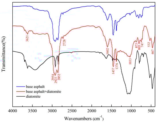 There are three new peaks for diatomic modified asphalt, compared with base asphalt. They are the vibrational peaks of water at 3621 cm−1, the stretching vibrations of Si–O bonds at 1033 cm−1, and the vibrational bands of inorganic compounds near the 500 cm−1, respectively. These peaks are the characteristic absorbed peaks for diatomite. It is observed that no new absorption peak appears on the spectrum of asphalt binder. Hence, it is proven that mixing of diatomite and asphalt is a simple physical blend. No new functional groups appear in the modified asphalt on account of the addition of diatomite.