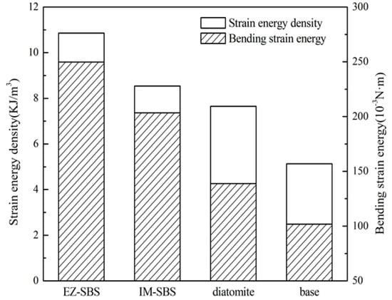 The test results are shown in Table 5 and Figure 9. It is seen that EZ-SBS-modified mixture shows the maximum tensile strain, strain energy density, and bending strain energy, followed by IM-SBS- and diatomite-modified mixtures. Compared with the base asphalt mixtures, the energy density and strain energy of mixtures with diatomite are improved to a certain extent. It may be ascribed to the hardening effects of asphalt adsorbed in the pores of diatomite at low temperatures, which enhanced the mechanical combination of asphalt and diatomite, further improving the low-temperature performance of diatomite asphalt mortar []. However, the extent of the improvement is not as great as that of SBS-modified asphalt.