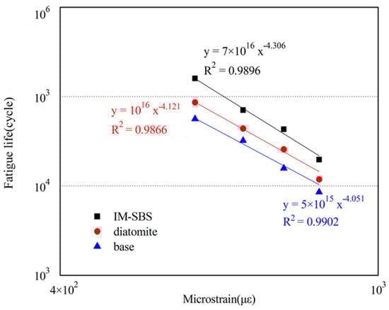 The fatigue lives of the three kinds of asphalt mixture beams specimens are shown in Figure 10. There are four microstrain levels including 500 με, 600 με, 700 με, and 800 με. It appears that the fatigue life of the IM-SBS-modified asphalt mixture is significantly greater than the other two kinds of mixtures. Meanwhile, compared with the base asphalt mixture, the fatigue performance of the asphalt mixture with diatomite is significantly improved. This is ascribed to the excellent compatibility between diatomite and asphalt, which can reduce mixing time, prevent aging of the modified asphalt, and directly improve the durability of asphalt mixture [].