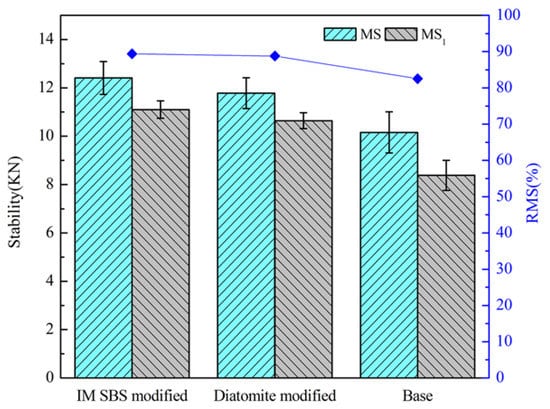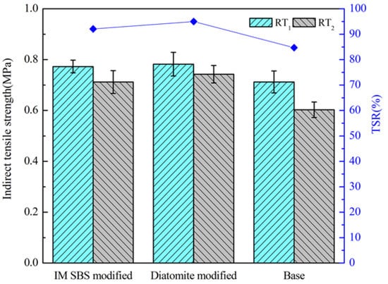 It can be seen that although the MS and MS1 of the asphalt mixture with diatomite are lower than those of the IM-SBS-modified asphalt mixture, their RMSs are approximately equal. The TSR of the diatomite-modified asphalt mixture is slightly higher than that of the IM-SBS-modified asphalt mixture. With the addition of diatomite, the parameter value of the asphalt mixture is higher than that of base asphalt mixture, leading to the increase in the cohesive force between the asphalt and the aggregate. It contributes to the increase in shear resistance and stability [].