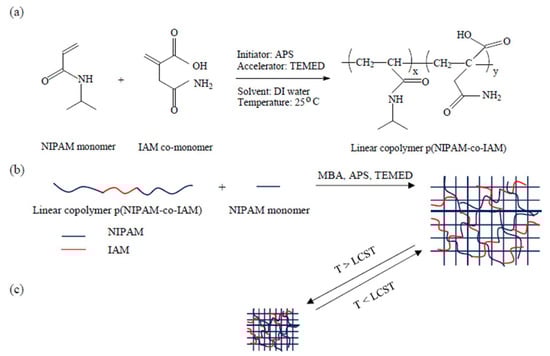 Preparation scheme of (a) Linear copolymer poly(N-isopropylacrylamide-co-itaconamic acid) (p(NIPAM-co-IAM)); (b) Semi-interpenetrating polymer network (semi-IPN) hydrogels; and (c) The coil-to-globule transition of semi-IPN hydrogels below and above lower critical solution temperature (LCST). APS, ammonium persulfate; TEMED, N,N,N′,N′-tetramethylethylenediamine; DI, deionized; MBA, N,N′-methylenebisacrylamide.