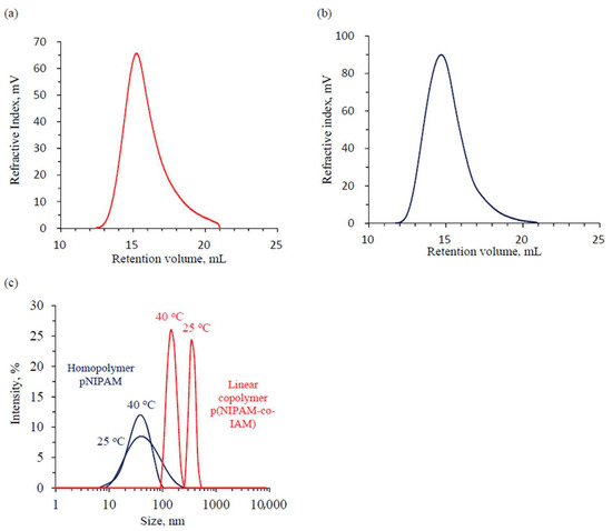 On the other hand, the linear copolymer p(NIPAM-co-IAM) had a larger hydrodynamic diameter and lower Mn than linear pNIPAM. The result is not consistent with the reports of Liu et al. and Yin et al. for poly(dimethylsiloxane) and hydrolyzed polyacrylamide, respectively [37,38]. This may be also due to the influence of ionized IAM fraction, as discussed above.