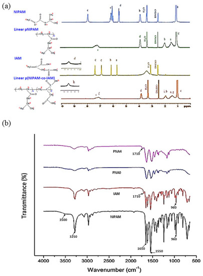 (a) 1H NMR and (b) FTIR spectra of monomers, linear polymers, and semi-IPN hydrogels.