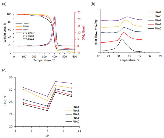 (a) TGA and DTG curves of linear copolymer p(NIPAM-co-IAM), conventional pNIPAM, and semi-IPN hydrogels; (b) DSC traces of hydrogels in DI water; (c) LCSTs of equilibrium swollen hydrogels in PBS with pH values ranging from 4 to 10 at 25 °C.