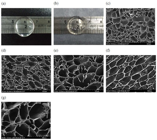 Figure 5a,b show photographs of conventional pNIPAM and semi-IPN hydrogels, respectively. The transmittance of the two samples is quite similar, indicating that the linear copolymer p(NIPAM-co-IAM) did not alter the structural state of the semi-IPN hydrogel. SEM images of the hydrogels in Figure 5c–g shows a porous structure with a relatively uniform pore size distribution. Wei et al. reported that fewer closed pores (with small size) were observed in conventional pNIPAM hydrogel [27]. In another report, Liu et al. reported that conventional pNIPAM hydrogel showed the typical microporous morphology with dense walls [24]. In this study, conventional pNIPAM hydrogel showed a clear uniform hollow structure. Moreover, it was observed that the average pore size was significantly affected by the linear copolymer content introduced into the semi-IPN hydrogels. They are listed in Table 3. Specifically, the PNA1 sample had the smallest pore size, 119 ± 16 µm, and the PNA4 sample had the largest pore size, 297 ± 61 µm. This may be related to the hydrophilicity of IAM and cross-linking density of the samples. From PNA1 to PNA4 samples, the linear copolymer content increased, leading to an increase in hydrophilicity and a decrease in cross-linking density. It was reported that the lower cross-linking density produced a hydrogel with larger pore size [42]. Besides, the more hydrophilic hydrogels absorbed more water and produced larger space inside them. Generally, pore size can be controlled by changing the linear copolymer content introduced into the semi-IPN hydrogels.