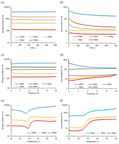The storage modulus (G’) and loss modulus (G’’) of conventional pNIPAM and semi-IPN hydrogels as a function of time and frequency are shown in Figure 6a–d. The results show that G’ values were independent of time and frequency and were much higher than G’’ values, showing a viscoelastic behavior of hydrogel materials [43]. It was also observed that G’ and G’’ values decreased with increased linear copolymer p(NIPAM-co-IAM) content introduced into the hydrogels. This could be explained by the flexibility of the polymer network. As the added volume of linear copolymer solution increased, the content of NIPAM and MBA decreased, leading to reduced cross-linking density in the obtained hydrogels. So, the flexibility of the hydrogels would increase due to generation of fewer entanglements in the hydrogel network to cause a reduction of elastic modulus [27,44].