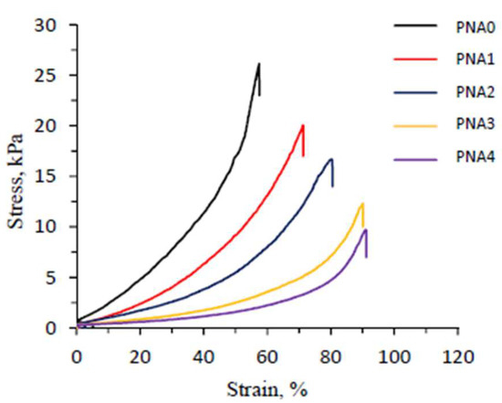 The stress-strain curves of conventional pNIPAM and semi-IPN hydrogels at room temperature are shown in Figure 7. The compressive modulus, fracture strain, and fracture stress of the hydrogels are listed in Table 3. It shows that compressive modulus and fracture stress decreased with pNIPAM content in the semi-IPN hydrogel, and the conventional pNIPAM hydrogel had the highest values. These results confirm that semi-IPN hydrogels with higher pNIPAM content have higher cross-linking density, which helps increase the modulus and the ability to resist stress. In addition, pore size also had an important effect on the mechanical strength of the semi-IPN hydrogels. Figure 5 and Table 3 confirm that the PNA4 sample had the largest pore size and least mechanical strength. This was because the hydrogels with small pore size prevented crack propagation, which was subjected to external forces because of the low stress concentration [45]. In other words, the stress distribution took place faster and easier in the hydrogel networks with smaller pore size.