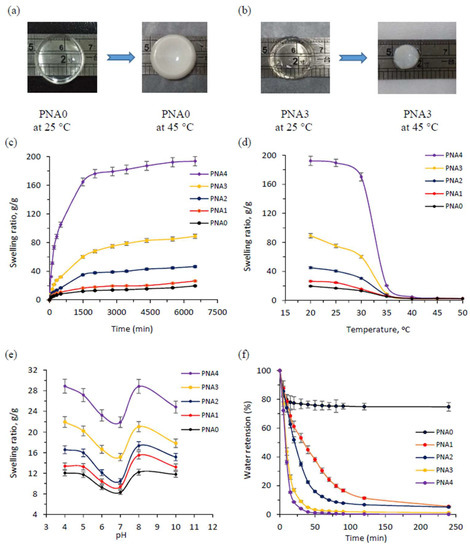 The thermo-sensitive property of the semi-IPN hydrogels is demonstrated in Figure 8d. In the temperature range of 20 to 30 °C, all of the hydrogel samples had high swelling ratios and a negligible decreasing trend. In the temperature range of 30 to 35 °C, there was a significant decreasing trend in the swelling ratios. Such a phenomenon could be explained by the strong influence of temperature on the phase transition of semi-IPN hydrogels. It can be noted from Figure 4b that the LCST values of the hydrogels varied from 31.6 to 32.7 °C for PNA0 and PNA4 samples, respectively. Generally, the thermo-responsive semi-IPN hydrogel shrunk above the LCST and swelled below the LCST. The LCST of the thermo-responsive hydrogel could be influenced by introducing hydrophobic or hydrophilic co-monomers to its network. In this work, the IAM hydrophilic monomer was introduced into the semi-IPN hydrogels, leading to gradually increased LCSTs and swelling ratios of the obtained hydrogels. However, Figure 8d shows no significant difference in the swelling ratios of the hydrogels at temperatures above LCST. This suggests that semi-IPN samples retracted to form the same network structure at these temperatures.