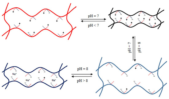 It was reported that the swelling ratios of hydrogel are influenced by the isoelectric point and the repulsion of moieties with the same type of charge in the material system. First of all, it is necessary to assume that in the aqueous solution, the functional groups –COOH and –NH2 are readily ionized to –COO− and NH3+. In the pH 7 buffer solution, the negatively and positively charged moieties were probably balanced and the hydrogel system reached the isoelectric point. At this point, the repulsion of moieties with the same type of charge almost disappeared, while the attraction of –COO– and NH3+ became strong and shrinkage took place in the hydrogel network, leading to the lowest swelling ratio. In the acidic buffer solutions (pH 4, pH 5, and pH 6), the functional groups –NH2 were ionized into –NH3+, leading to a greater quantity of positive charges than negative charges. On the contrary, in the pH 8 buffer solution, the –COOH groups were ionized into –COO–, resulting in a greater quantity of negative charges than positive charges. In both cases, the hydrogel networks expanded rapidly by electrostatic repulsion, leading to increased swelling ratios. However, as the pH value went up from 8 to 10, the swelling ratios reduced slightly. This may be because the existence of alkaline ions in the swelling environment with high concentration caused a “charge screening effect” [49]. These positive ions function to reduce the electrostatic repulsion between the same charged –COO– groups. This caused the polymer structure to come closer and reduced expansion, leading to decreased swelling ratios. The mechanism for the influence of pH values on the swelling ratios of the hydrogels is illustrated in Figure 9.