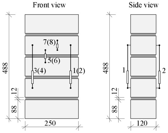 The behavior of calcium silicate brick masonry under long-term loads was analyzed by testing masonry samples made of five 250 × 125 × 88 mm masonry units and 11–12 mm thickness mortar without head joints. The average normalized compressive strength of masonry units is 22 N/mm2. The height of samples is 488 mm, the thickness of the bed joint is 12 mm (Figure 2). Longitudinal deformation of masonry was measured at points 1–4 (gauge length 200 mm), deformation of brick is measured at points 5 and 6 (gauge length 62 mm), and bed joints deformation at points 7 and 8 (gauge length 50 mm). The investigation of such samples allows us to test experimentally the behavior of bed joints (mortar and contact) under long-term loads.