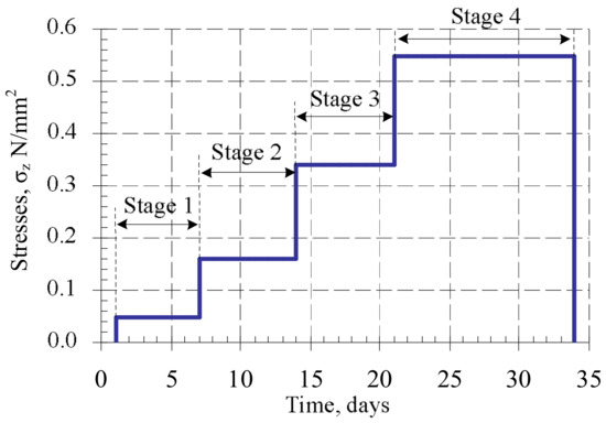 The creep is characteristic to masonry, as well as to concrete, i.e., the tendency to deform for a long time under the influence of a constant load. Creep is a very important feature in evaluating the distribution of stresses [11,12]. Other authors argue as well that masonry creep deformations heavily influence the distribution of stresses which affect masonry during a structure’s lifetime [13,14,15,16,17]. Creep redistribution of stresses in brickwork walls will result in reducing the stress on the vertical mortar joints and increasing it on horizontal bed joints [18,19]. As shown by [20,21], creep deformations may be several times bigger than those occurring from a short-time effect. Creep characteristics of materials depend on the mechanical properties of the material. In many cases, the properties of separate layers vary differently with time under loads. The change of properties of components determines the characteristics of creep on the whole composite unit. Such behavior is specific to masonry because of the age of masonry units and mortar. Therefore, the mechanical properties as well are different during the load-time.