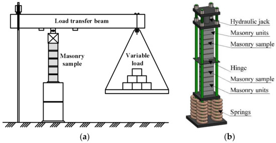 Masonry samples (B8 series) were subjected to long-term constant loads after 34 days of curing (when masonry has reached its design strength). The duration of loading took 140 days (Figure 3b.) The intensity of the applied long-term load is expressed as , (where is compressive strength of masonry). The samples underwent the long-term load from a hydraulic jack (Figure 4).