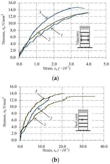 Relative average linear strains, 1—series B5; 2—series B6; 3—series B8: (a) masonry subjected to short-time load: 1—series B5; 2—series B6; 3—series B8; (b) masonry bed joint subjected to short-time load.