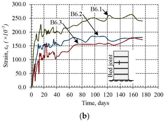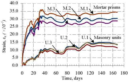 The average shrinkage strains of bed joints are 5–6 times greater than the average shrinkage strains of masonry (Figure 7).