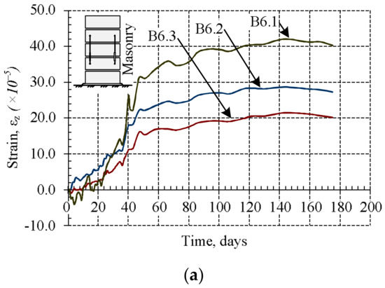 During the research masonry, masonry units‘, bed joints‘, and mortar shrinkage–thermal strains were measured for B6 samples. The measurements were started after 24 h passed from the formation of the samples. The results are presented in Figure 6 and Figure 7.