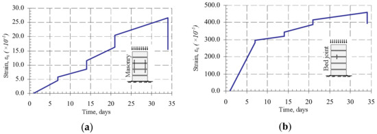 From the diagrams (Figure 9), it can be seen that masonry creep deformations intensively develop at the first days of loading, corresponding to the first stage of creep, which in this case lasted about 10 days. The second stage of creep is observed during further investigation, and it lasts until the end of the study. The results show that the relative linear strains of masonry units are not significant compared to mortar joint deformations, therefore it can be concluded that the bed joint deformations determine the masonry longitudinal deformations.