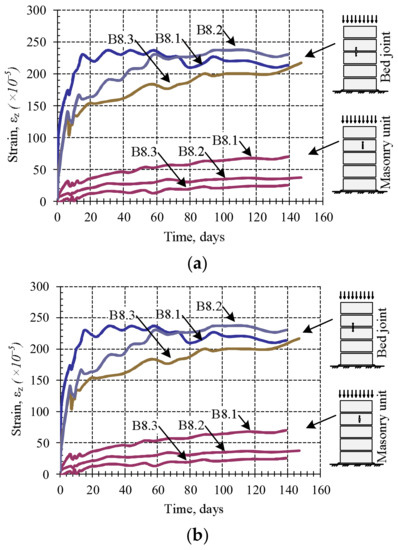 The results show that mortar shrinkage strains are significantly (2–2.5 times) bigger than masonry unit deformations (Figure 6). The shrinkage strains of masonry and bed joints were first measured as soon as the masonry samples were formed, with the results presented in Figure 7. At the first stage (up to 10 days), the masonry is expanding (Figure 7a), and at the same time, masonry bed joints shrink rapidly (Figure 7b). The expansion of masonry is related to the fact that masonry units take water from bed joint mortar rapidly. Later, some moisture from the masonry unit is released into the environment and comes back to the mortar, causing the masonry to shrinks [5].