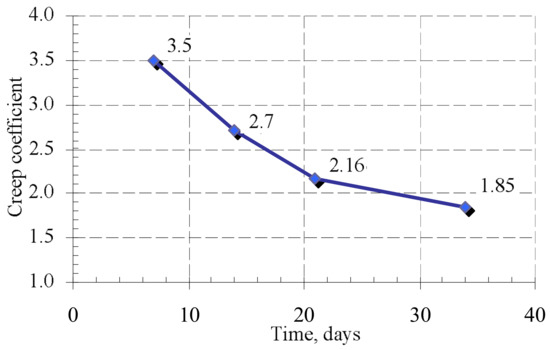 After analyzing the creep deformations of masonry under variable loads, the change of the creep coefficient was determined when the intensity of long-term load and mortar strength increases. The results are presented in Figure 10. The studies have shown that the creep coefficient decreases over time. This can be explained by the fact that the compressive strength of mortar increases, and the mortar is thickened in the contact zone. The results show in Figure 11 that the creep (long-term) deformations of masonry under variable long-term loads calculated according to the Equation (15) coincide quite well with the deformations determined by the experiments. The calculation results were compared to the experimental ones, which are shown in Figure 11.