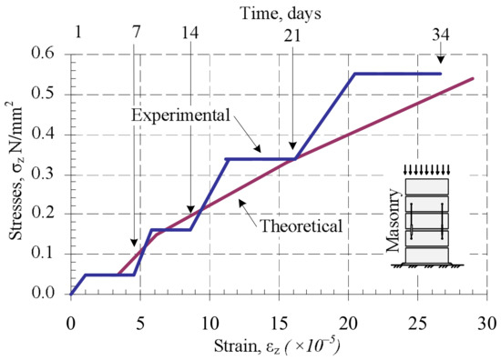 The research of [28] shows that the mechanical properties of loaded composite units stay constant over time when the constant strength is reached. However, the masonry is loaded gradually while the mortar has not reached the design strength because of the building technology features. Therefore, deformational properties of mortar change over time.