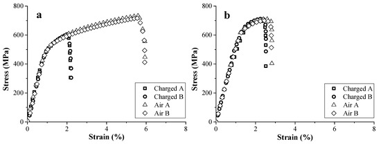 Stress-strain curves for (a) Fe-C-Ti; (b) and Fe-C-V alloy B at a cross-head deformation speed of 5 mm/min of uncharged (air) and H-saturated (charged) samples.