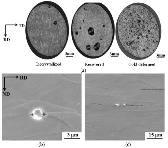 The H/material interaction was further studied in generic alloys to avoid the effect of complex microstructural characteristics. A H-induced crack analysis was also done in an ultra-low carbon steel by exposing it to electrochemical H charging [49]. Three material conditions, i.e., cold deformed, recovered, and recrystallized, were considered to assess the impact of deformation-induced defects, such as dislocations and microvoids [70], on the HIC sensitivity. Generally, H diffusion is hindered by such defects, which stimulates H accumulation and thus causes easier crack initiation at these sites. Therefore, the H-induced blister formation is promoted by these defects, as shown in Figure 11. However, a certain critical concentration of H needs to be reached before initiation of blisters occur. If this critical concentration is reached, H recombination will occur, and blister formation takes place according to the internal pressure theory [66], which was confirmed by EBSD in [49]. The H charging time at a specific charging current density required to achieve this concentration is decreased for deformed material compared to heat treated material since a higher amount of crack initiation sites are present in deformed material due to the presence of a higher density of deformation-induced defects. Initiation of HICs in recrystallized material was related to debonding of inclusions which were found in the material, as illustrated in Figure 11. The same observations were made by Tiegel et al. [71]. They stated that H accumulation occurred at the interfaces of incoherent particles, causing an interface failure. Moreover, the high H concentration created vacancy stabilization providing the required space to form molecular H and the consequential internal pressure build-up resulted into cracks. Additionally, the cracking behavior was also largely affected by the applied current density (10 vs. 20 mA/cm2), which was linked to a change in the internal crack morphology. Cracks were dominantly transgranular at low current density. The favorable crack propagation paths were associated to high dislocation density slip planes. While intergranular crack propagation along high angle grain boundaries occurred at higher current density.
