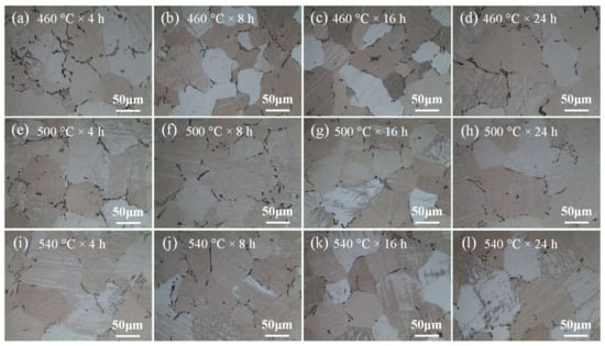 - In one-step homogenization, the morphology of CaMgSn and grain size has no obvious change when homogenized at 460 °C. While at 500 °C and 540 °C, the CaMgSn is dissolved gradually from long strip-like into short rod-like or chain-like with the increase of homogenization time, and the grains grow obviously when the homogenization time exceeds 16 h.