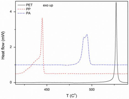 FTIR analysis confirmed DSC results, showing peaks characteristic for functional groups of main textile polymers, without any additives (Figure 3) [22,23,24].