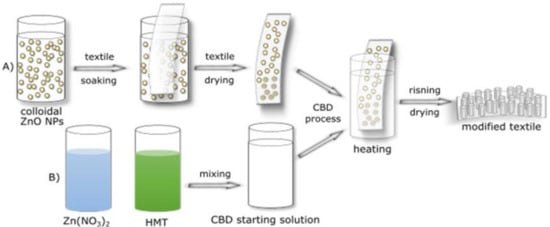 A scheme of modification process. (A) ZnO NPs deposition; (B) CBD solution preparation.