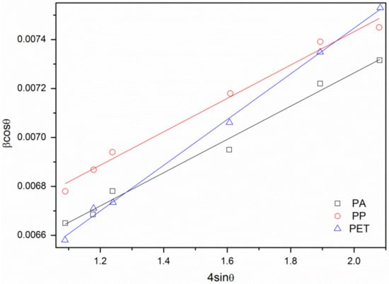 To perform a thorough characterization of obtained ZnO crystals, interplanar distances, lattice constants, and the unit cell volume were calculated [25]. It was observed that the values of lattice constants and the unit cells volume are similar for all samples and are bigger than the standard values for zinc oxide cell (Table 4). The microstrains and average crystallite size in ZnO were also determined, using the Williamson–Hall (W-H) method [26]. To calculate the strain curve and crystallite size, βcosϕ = f(4sinϕ) was plotted for preferred diffraction peaks (Figure 6).