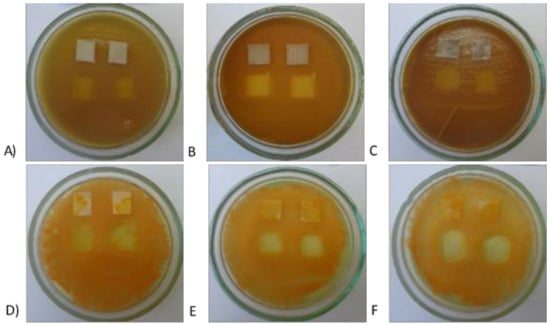 The effect of the modified polymer textiles on the viability of E. coli (PET-ZnO (A); PA-ZnO (B); and PP-ZnO (C)) and S. aureus (PET-ZnO (D); PA-ZnO (E); and PP-ZnO (F)) determined by the plate method.