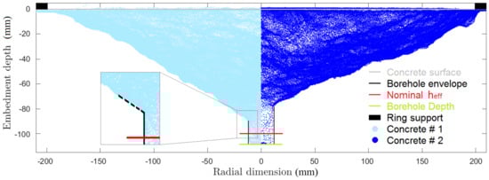 For the crater depth estimate, each individual slice is plotted in a diagram of embedment depth (y-axis, vertical dimension) versus radius (x-axis, radial dimension). Points having a radial coordinate value within 15 mm and 30 mm serve as data basis for linear regression (as shown in Figure 2 by the dashed black line). The measured crater depth is obtained as intercept of the linear extrapolation with the nominal anchor diameter. Figure 2 exemplarily shows the difference between two concrete craters and the information related to the set-up (supports, borehole depth and nominal embedment depth).