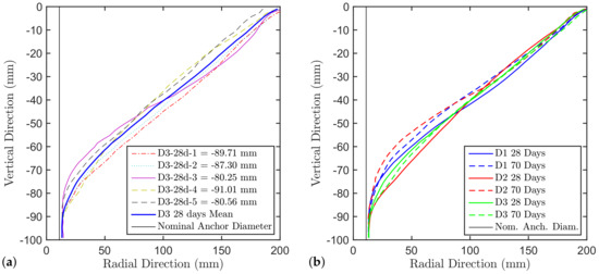 Figure 3a shows the individual mean crater profiles of the D3 concrete at 28 days as an example, while Figure 3b shows the comparison of the mean crater profiles of the different batches and different ages. From the latter it can be seen that generally the crater is shallower at 70 days compared to 28 days even though the concrete tensile capacity is higher. All the crater profiles converge on one end to the support ring and on the other end to the undercut (excavated by the drill bit) which was destroyed during the test. Note, although the cones converge to the support ring, no effect on the pull-out capacity can be expected since the support distance in this study was chosen to be . This is larger then the code requirement of for unconfined tests supported by many experimental studies. The reason is that the peak load in a pull-out test is reached well before the crack approaches the surface (when the relative crack length approaches about 40% of the distance to the surface). Above there is no noticeable influence of the boundary conditions on the stress field governing the behavior up to the peak load.