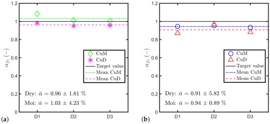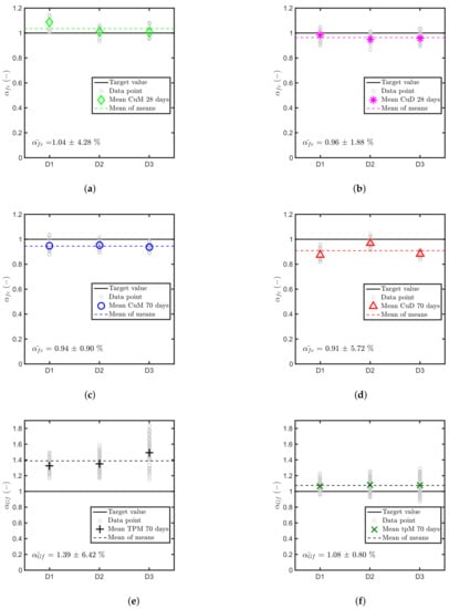 The proposed combinations method introduces the chance to obtain a distribution of normalised pull-out loads () rather than a single number. Figure 6a,b show the results of Equation (5) using as concrete properties the compressive strength both for the dry and the moist cases at 28 days. Figure 6c,d show the same results at 70 days. The results of the combination method enforce the mean value analysis results and provide an estimation of the scatter propagated from the test results. It is interesting to note that the scatter within a batch is typically larger than the relative difference between the batches, thus confirming that the “aggregate effect” is negligible, at least from a practical point of view.