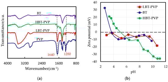 (a) FT-IR spectra of BT, HBT-PVP LBT-PVP and PVP; (b) relationship of zeta potential and pH of BT, LBT-PVP, and HBT-PVP in H2O.