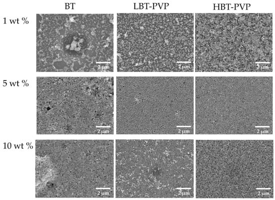 SEM images of the thin films prepared using different content of BT, LBT-PVP, and HBT-PVP in EtOH coated on PET. The contents of particles in EtOH are 1, 5, 10 wt %.