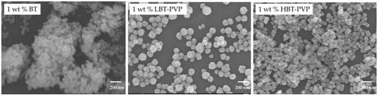 As the particle size of BT decreases, the aggregation of nanoparticles becomes a serious problem. This induces defects in the thin films and imparts an uneven surface, and the nanoparticles cannot exhibit their inherent characteristics, which reduces the performance of the electrical components. In order to solve this problem, highly dispersible BT nanoparticles were prepared with polyvinylpyrrolidone (PVP) by the low temperatures synthesis (LTS) and hydrothermal (HT) process, referred to as LBT-PVP and HBT-PVP respectively, as reported in our previous paper [,]. The nanoparticles prepared by these methods can be dispersed as suspension in a coating slurry, and with these particles thin film layers can be prepared easily and quickly by a bar coating process as Itoh et al. reported []. This process does not require high-temperature treatment and the performance of the film depends on the crystalline phase of the powder. The characteristic of this process is that there is no troublesome process and the performance of the thin-film can be easily controlled. It is expected that highly dispersible nanomaterials contribute to the densification of the film and improve the performance of the device by this method.