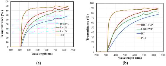 (a) Transmittance spectra of LBT-PVP films prepared in different concentration suspension from 1 to 10 wt % in EtOH. (b) Optical transmittance spectra of films prepared by different particles of BT, LBT-PVP, and HBT-PVP on PET. The particle content of coating agent is 5 wt %.