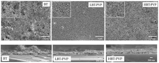 Presently, silicon wafers are extremely utilized substrates to build electronic devices, BT thin films on the Si substrates is expected as microelectronic devices []. In this study the film is also coated on Si substrate with 5 wt % coating agents. Figure 7 shows the surface and cross section morphology of the films coated on Si wafers. The same trend of morphology can be observed as on PET (Figure 3 and Figure 5). The surface of BT film is rougher compared to those of PVP-coated BT films. The particles are densely arranged in the films prepared by high-dispersion BT-PVP, but the particles aggregate in the film prepared by BT as shown in the high-magnification SEM images. The thickness of these films are estimated to be about 209, 292, and 293 nm from the cross section images for the BT, LBT-PVP, and HBT-PVP, respectively.