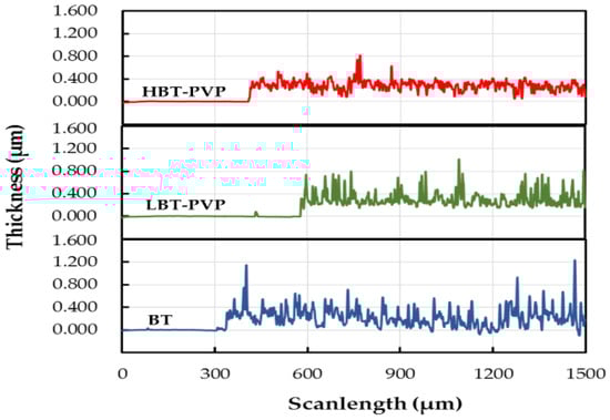 Stylus profiles of BT, LBT-PVP, and HBT-PVP films coated on Si substrates measured by stylus profiler.