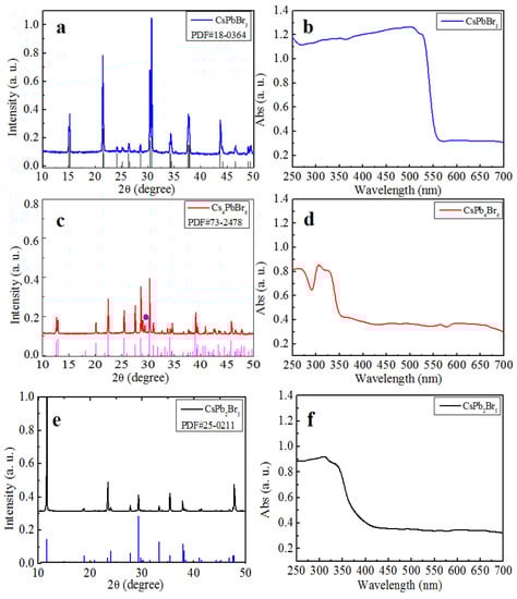The XRD pattern of (a) CsPbBr3, (c) Cs4PbBr6 and (e) CsPb2Br5. The absorption spectra of (b) CsPbBr3, (d) Cs4PbBr6, and (f) CsPb2Br5.