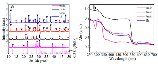 To confirm the two-step transformation model suggested above, we added pure CsPbBr3 into deionized water and investigated the conversion. We found that the transformation in Equation (4) occurred and a white precipitate was formed quickly. As shown in the XRD pattern obtained from the precipitate in Figure 4a, the diffraction peaks related to CsPbBr3 became weak and strong diffraction peaks corresponding to CsPb2Br5 were observed after 1 min. Moreover, the intensity of CsPb2Br5 gradually increased as the reaction progressed. The absorption spectra in Figure 4b, show that the absorption peak at 560 nm from CsPbBr3 became progressively weaker. We note that the absorption peak of CsPbBr3 did not completely disappear, even after 1 h of reaction, indicating that a small amount of CsPbBr3 persisted. The XRD and absorption results clearly demonstrated that CsPbBr3 could be converted to CsPb2Br5 through extraction of CsBr by water. The conversion induced by water extraction is undoubtedly one of the reasons leading to the unstable luminescent property of CsPbBr3. The water vapor in the air can extract CsBr from CsPbBr3 and trigger the conversion into CsPb2Br5, which subsequently results in the degradation of luminescence.