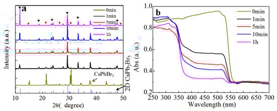 (a) XRD patterns and (b) absorption spectra of CsPbBr3 solids after water treatment for different times. Red diamonds represent CsPbBr3 and black hearts denote the diffraction peaks of CsPb2Br5.