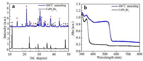 We realized a conversion from CsPb2Br5 to CsPbBr3, using a previously reported annealing method [19]. We annealed the CsPb2Br5 solids at 400 °C in air for 4 h and monitored the associated XRD and absorption properties. Figure 5a shows XRD data of the CsPb2Br5 before and after annealing. The corresponding diffraction peaks before annealing were indexed to CsPb2Br5. After annealing, the main product corresponded to CsPbBr3 and PbBr2, and a small amount of CsPb2Br5 remained. The decomposition is depicted by the Equation: