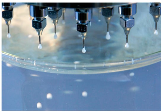 Li4SiO4 in powder form purchased from Albemarle (Frankfurt, Germany) was used as the starting material. First, the process involved the preparation of a Li4SiO4 aqueous suspension with sodium alginate ((C6H7NaO6)n purchased from Sigma-Aldrich, Darmstadt, Germany). After this, the suspension was forced to pass through a nozzle plate to form droplets. Finally, the droplets were dropped into an aqueous solution of calcium chloride (CaCl2 purchased from Sigma-Aldrich, Darmstadt, Germany) where they coagulated in solid spheres (Figure 3). After these steps, the obtained spheres were dried and sintered to form Li4SiO4 pebbles.