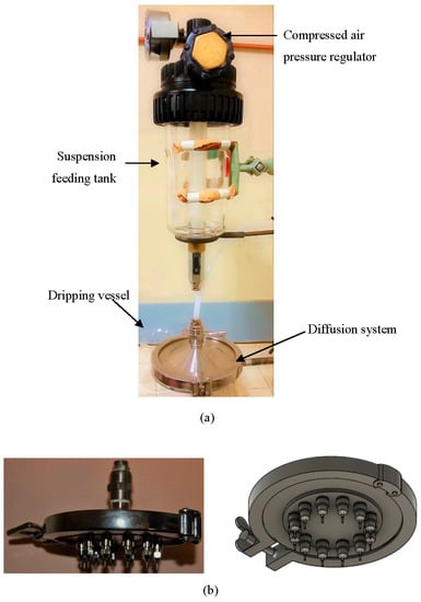 The feeding tank was connected to a compressed air line and equipped with a pressure regulator in order to ensure the dripping of the slurry through the nozzles. A pressure of around 2 atm was used for dripping.