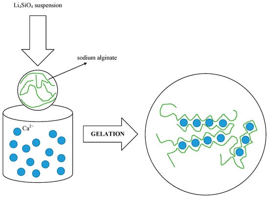 The principle of the drip casting technique involves the solidification of the Li4SiO4 suspension by the formation of cross-links among the alginate polymeric chains. When the suspension drops into the saline solution, the alginate sodium cations are replaced by divalent cations (Ca2+), before immediate irreversible gelation takes place.