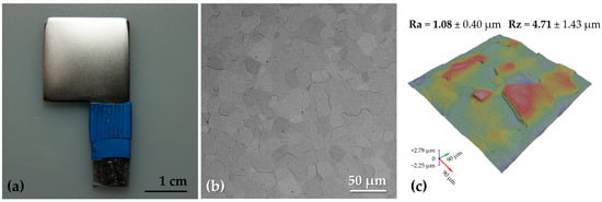 Zirconium surface after the etching was visibly smoothed and acquired a degree of luster (Figure 1a), however, at the microscopic scale, the grained structure was revealed (Figure 1b). Such a long etching time (2 min) was necessary since shortening of this process resulted in the formation of dark residue composed of corrosion products of Zr and the remainder of the SiC particles after the grinding.