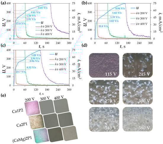 Voltage (U) and current density (i) transients recorded during the galvanostatic and potentiostatic steps of the PEO treatments in the Ca1P2 (a), Ca2P1 (b), and (CaMg)2P1 (c) solutions; macroscopic views of the zirconium surface at different points of the PEO process in the (CaMg)2P1 solution (d); and surface appearances after the treatment (e).